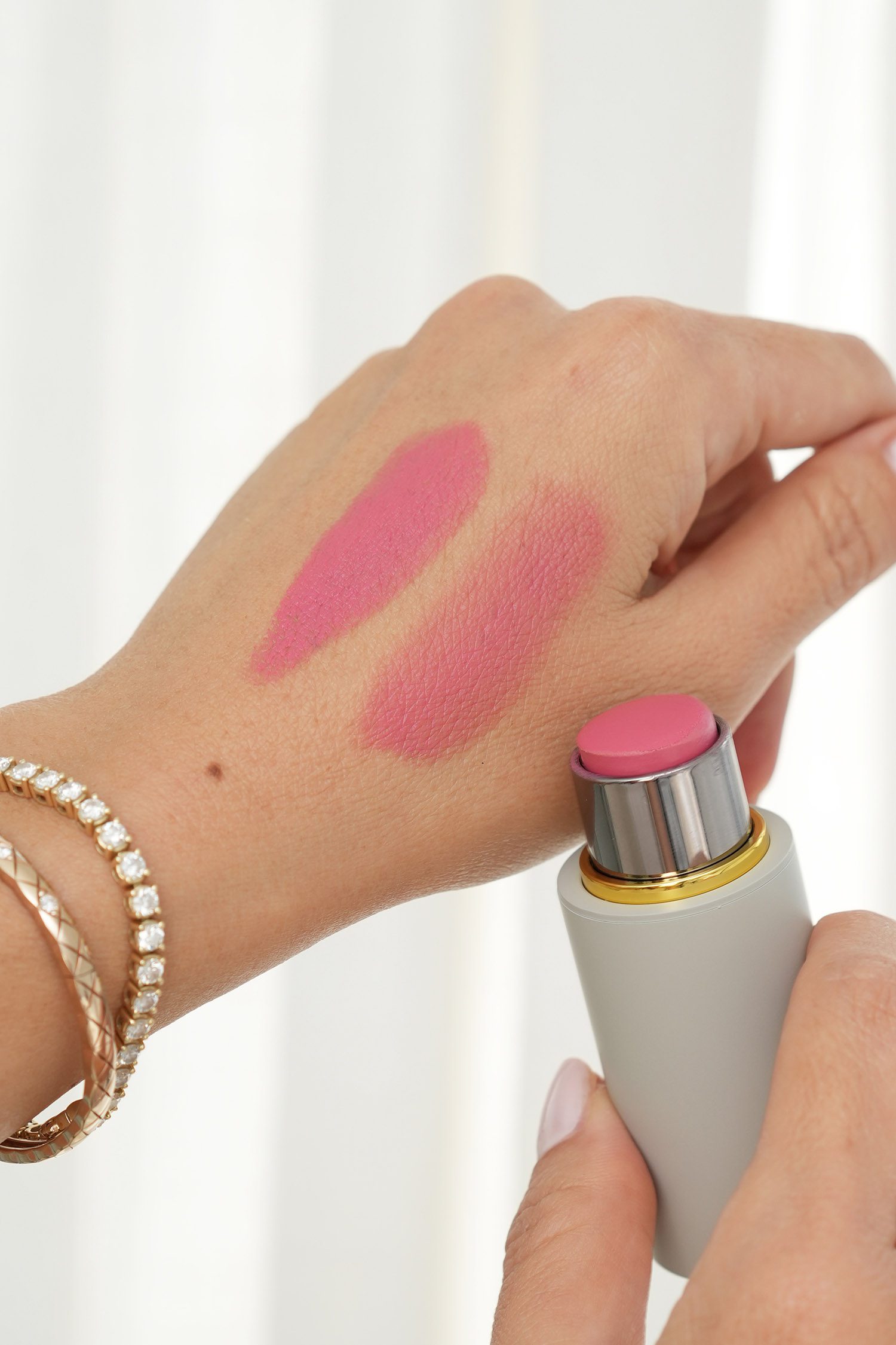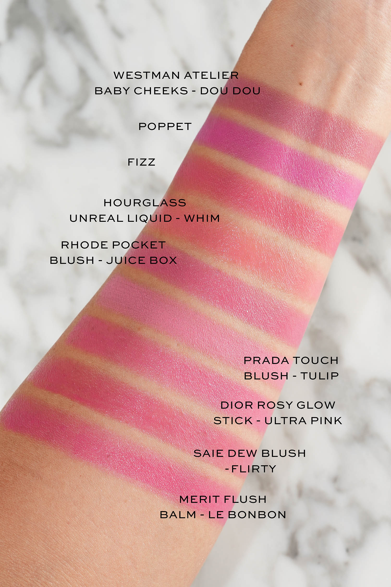 It blends out to a more natural flush. Color-wise I find it similar to Saie’s Dew Blush in Flirty and Rhode Pocket Blush in Juice Box (review here). Also swatched next to the Hourglass Unreal Liquid Blush in Whim (review here), Prada Touch Blush in Tulip (demo here, review soon), Dior Rosy Glow Blush Stick in Ultra Pink (review here), Saie Dew Blush in Flirty, and Merit Blush Balm in Le Bonbon (in action here).